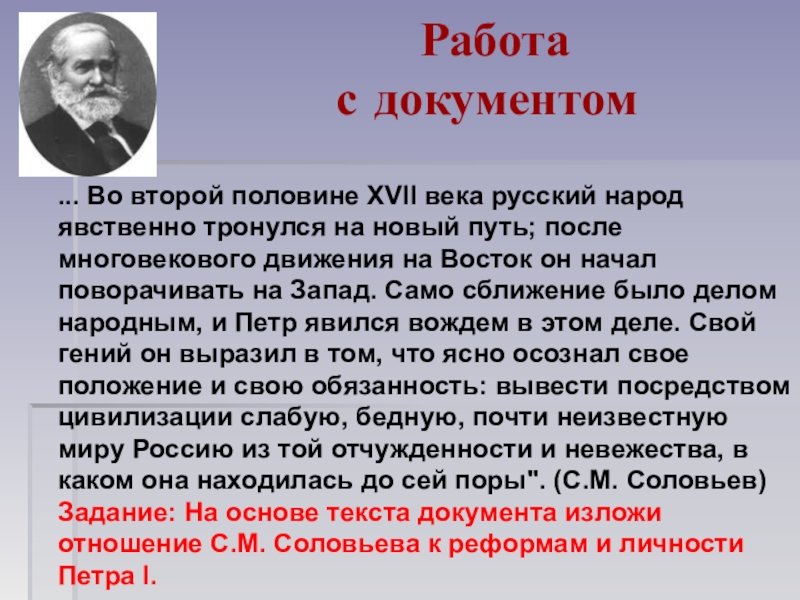 Задание: На основе текста документа изложи отношение С.М. Соловьева к реформам и личности Петра I.
