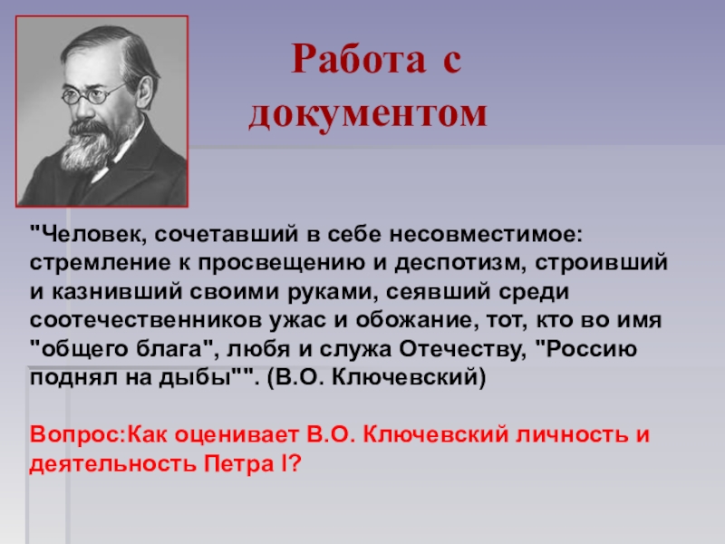 Вопрос:Как оценивает В.О. Ключевский личность и деятельность Петра I?