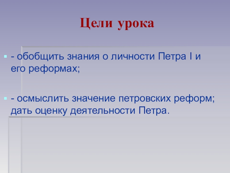 осмыслить значение петровских реформ; дать оценку деятельности Петра.