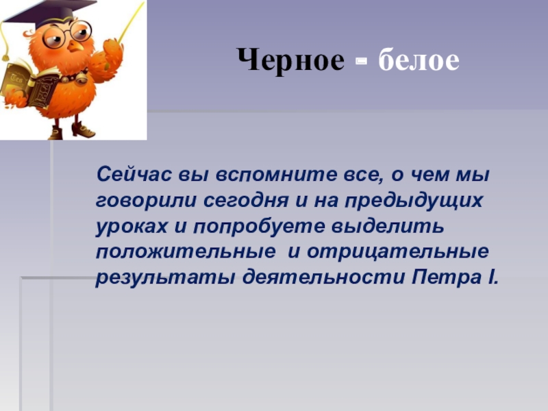 сегодня и на предыдущих уроках и попробуете выделить положительные и отрицательные результаты деятельности Петра I.