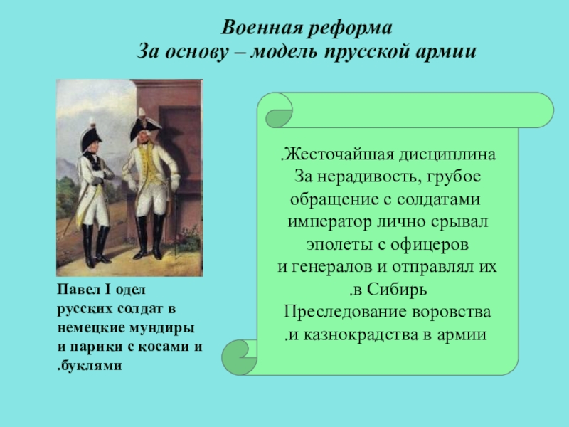 Павел I одел русских солдат в немецкие мундиры и парики с косами и буклями.