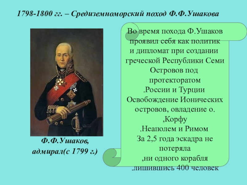 1798-1800 гг. – Средиземноморский поход Ф.Ф.Ушакова