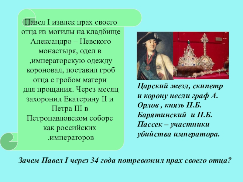 Царский жезл, скипетр и корону несли граф А.Орлов , князь П.Б.Барятинский и П.Б.Пассек – участники убийства императора.