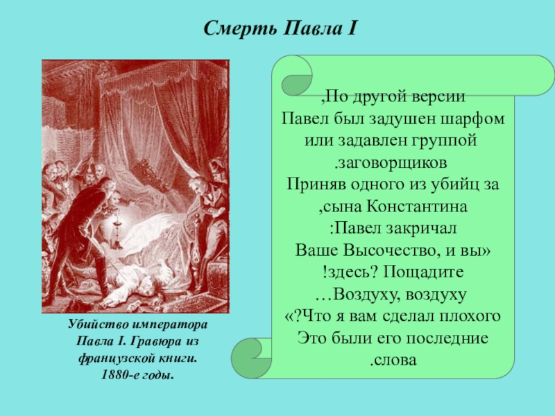 Убийство императора Павла I. Гравюра из французской книги. 1880-е годы.