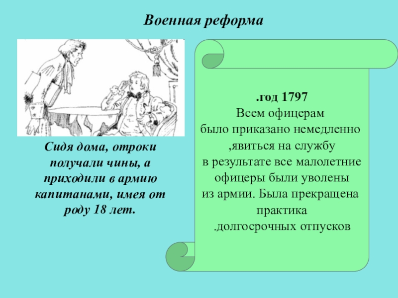 Сидя дома, отроки получали чины, а приходили в армию капитанами, имея от роду 18 лет.
