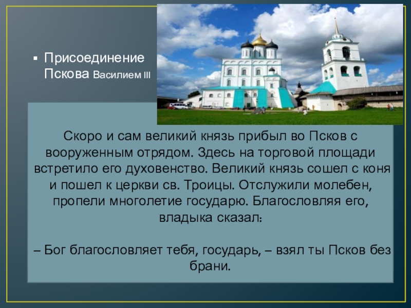 Скоро и сам великий князь прибыл во Псков с вооруженным отрядом. Здесь на торговой площади встретило его духовенство. Великий князь сошел с коня и пошел к церкви св. Троицы. Отслужили молебен, пропели многолетие государю. Благословляя его, владыка сказал: