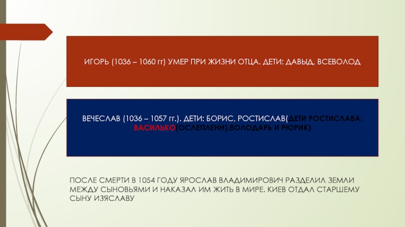 ВЕЧЕСЛАВ (1036 – 1057 гг.). ДЕТИ: БОРИС, РОСТИСЛАВ(ДЕТИ РОСТИСЛАВА: ВАСИЛЬКО(ОСЛЕПЛЕНН),ВОЛОДАРЬ И РЮРИК)