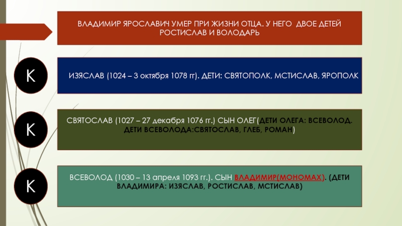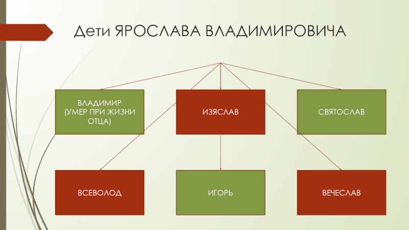 ПОСЛЕ СМЕРТИ В 1054 ГОДУ ЯРОСЛАВ ВЛАДИМИРОВИЧ РАЗДЕЛИЛ ЗЕМЛИ МЕЖДУ СЫНОВЬЯМИ И НАКАЗАЛ ИМ ЖИТЬ В МИРЕ. КИЕВ ОТДАЛ СТАРШЕМУ СЫНУ ИЗЯСЛАВУ