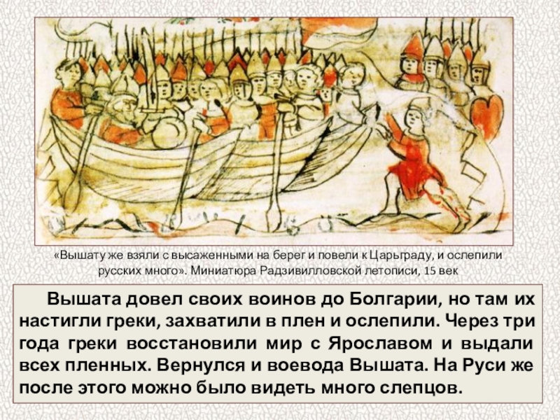 «Вышату же взяли с высаженными на берег и повели к Царьграду, и ослепили русских много». Миниатюра Радзивилловской летописи, 15 век