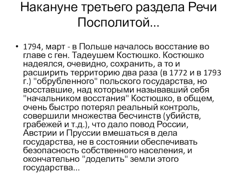 во главе с ген. Тадеушем Костюшко. Костюшко надеялся, очевидно, сохранить, а то и расширить территорию два раза (в 1772 и в 1793 г.) "обрубленного" польского государства, но восставшие, над которыми называвший себя "начальником восстания" Костюшко, в общем, очень быстро потерял реальный контроль, совершили множества бесчинств (убийств, грабежей и т.д.), что дало повод России, Австрии и Пруссии вмешаться в дела государства, не в состоянии обеспечивать безопасность собственного населения, и окончательно "доделить" земли этого государства...