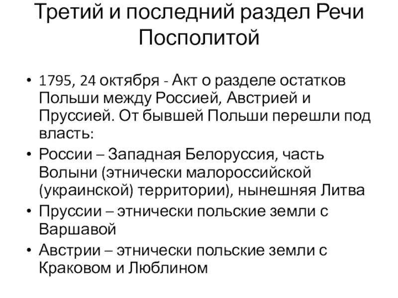 разделе остатков Польши между Россией, Австрией и Пруссией. От бывшей Польши перешли под власть: