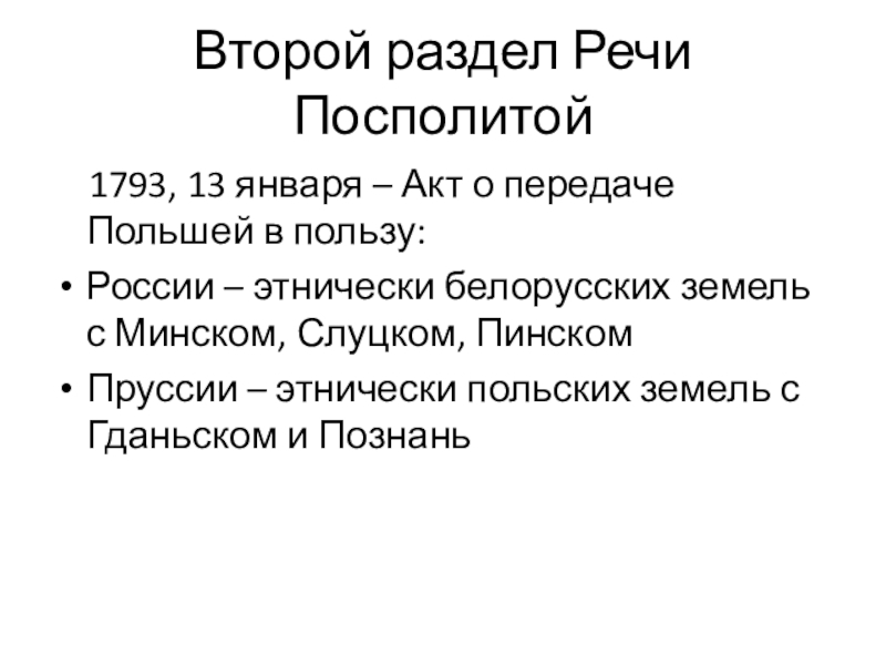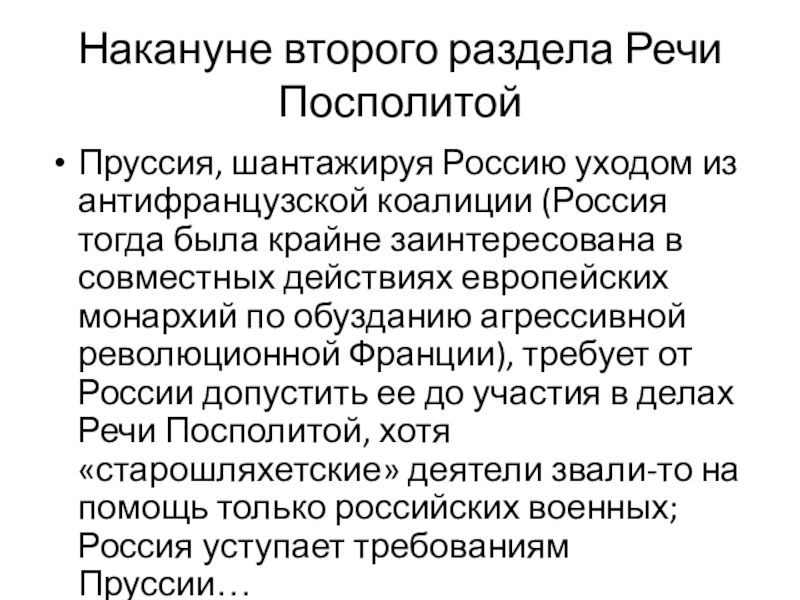 (Россия тогда была крайне заинтересована в совместных действиях европейских монархий по обузданию агрессивной революционной Франции), требует от России допустить ее до участия в делах Речи Посполитой, хотя «старошляхетские» деятели звали-то на помощь только российских военных; Россия уступает требованиям Пруссии…