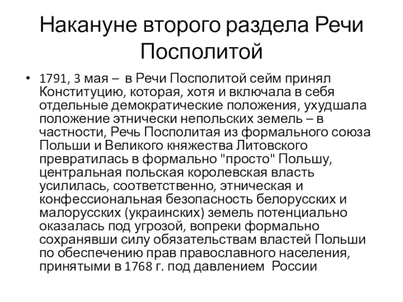 сейм принял Конституцию, которая, хотя и включала в себя отдельные демократические положения, ухудшала положение этнически непольских земель – в частности, Речь Посполитая из формального союза Польши и Великого княжества Литовского превратилась в формально "просто" Польшу, центральная польская королевская власть усилилась, соответственно, этническая и конфессиональная безопасность белорусских и малорусских (украинских) земель потенциально оказалась под угрозой, вопреки формально сохранявши силу обязательствам властей Польши по обеспечению прав православного населения, принятыми в 1768 г. под давлением России