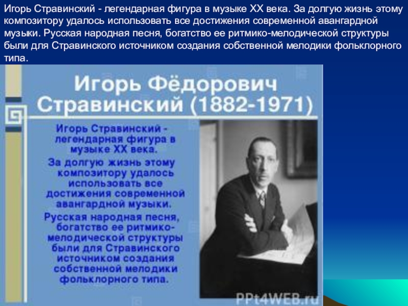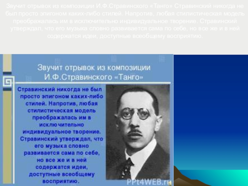 Звучит отрывок из композиции И.Ф.Стравинского «Танго» Стравинский никогда не был просто эпигоном каких-либо стилей. Напротив, любая стилистическая модель преображалась им в исключительно индивидуальное творение. Стравинский утверждал, что его музыка словно развивается сама по себе, но все же и в ней содержатся идеи, доступные всеобщему восприятию.