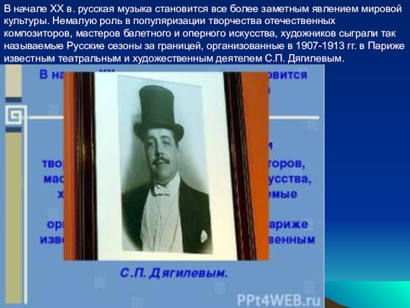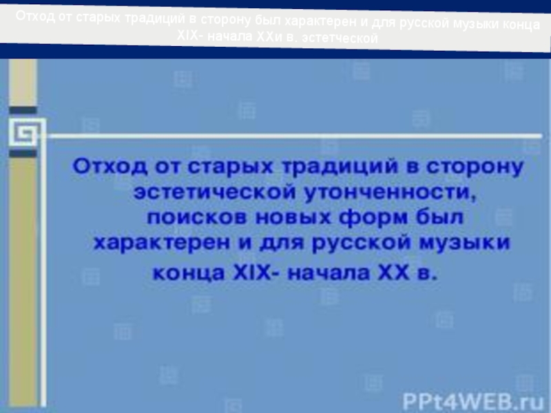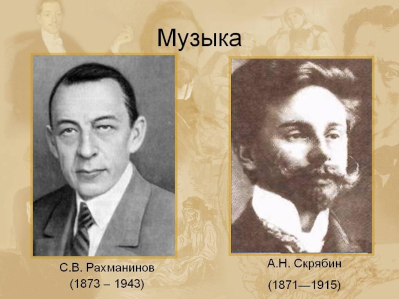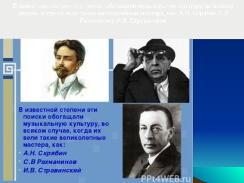 В известной степени эти поиски обогащали музыкальную культуру, во всяком случае, когда их вели такие великолепные мастера, как: А.Н. Скрябин С.В Рахманинов И.В. Стравинский