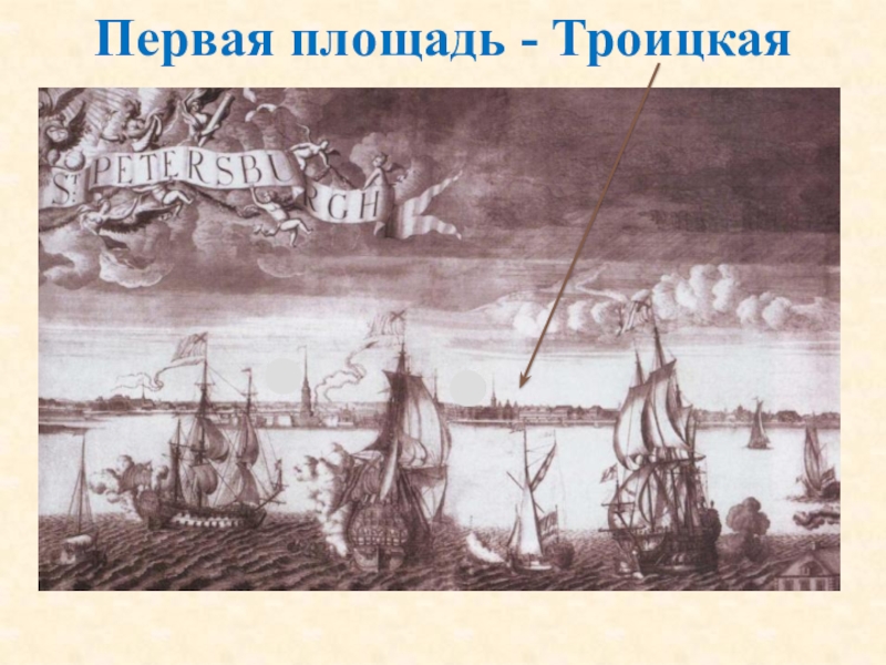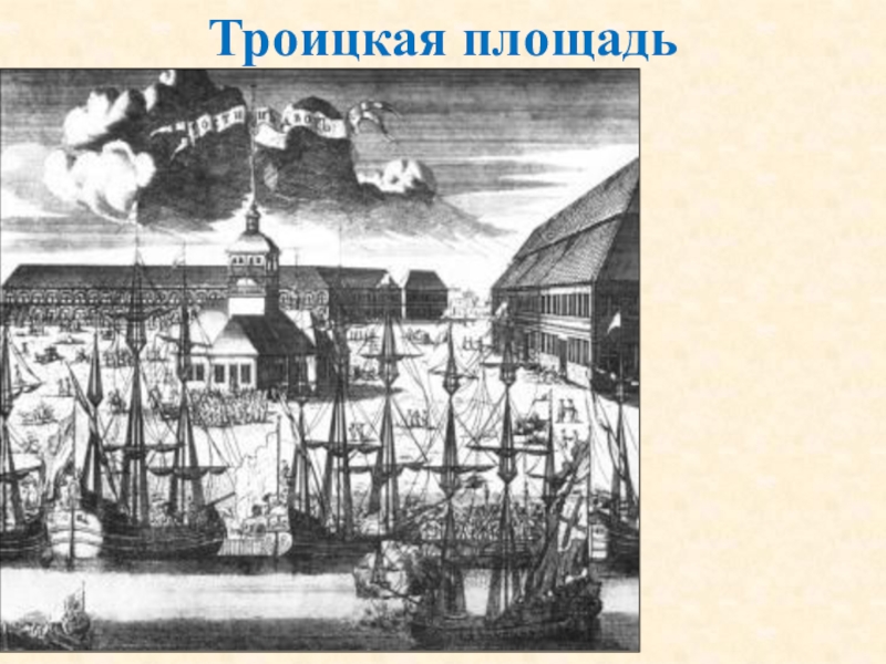 Троицкая площадь12341234Троицкий соборГостиный дворЗдание КоллегийПортНа площади располагались Троицкая церковь (деревянная), гостиный двор, здание коллегий, первый кабак «У