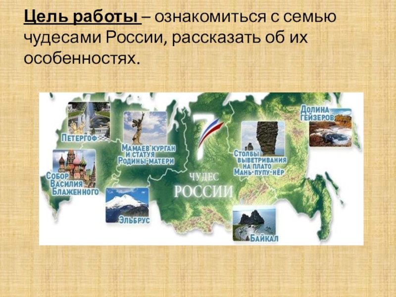 Слайд 4Цель работы – ознакомиться с семью чудесами России, рассказать об их