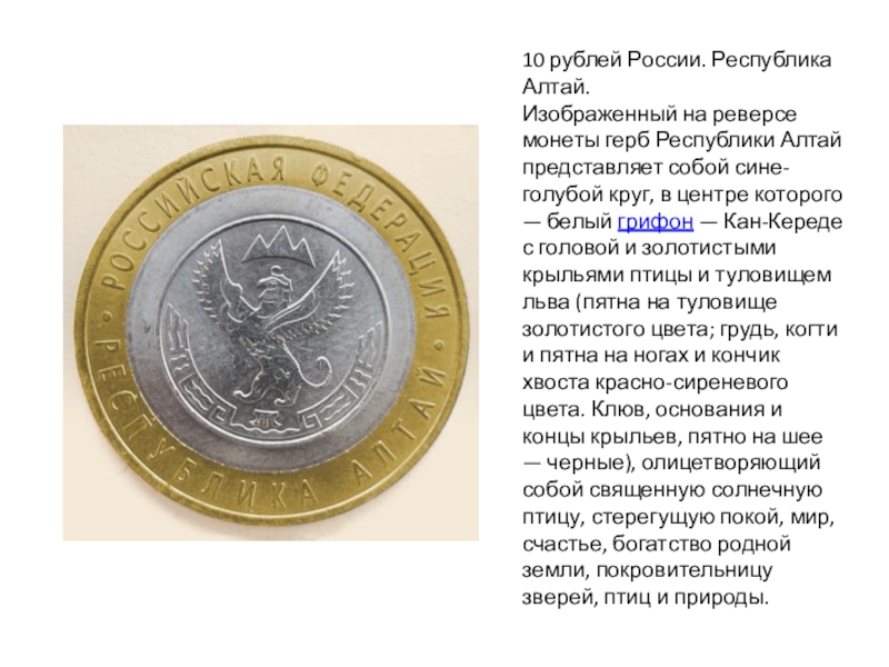 представляет собой сине-голубой круг, в центре которого — белый грифон — Кан-Кереде с головой и золотистыми крыльями птицы и туловищем льва (пятна на туловище золотистого цвета; грудь, когти и пятна на ногах и кончик хвоста красно-сиреневого цвета. Клюв, основания и концы крыльев, пятно на шее — черные), олицетворяющий собой священную солнечную птицу, стерегущую покой, мир, счастье, богатство родной земли, покровительницу зверей, птиц и природы.