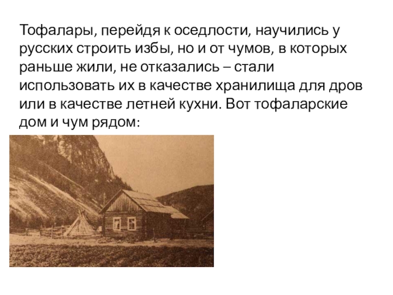 Слайд 53Тофалары, перейдя к оседлости, научились у русских строить избы, но и