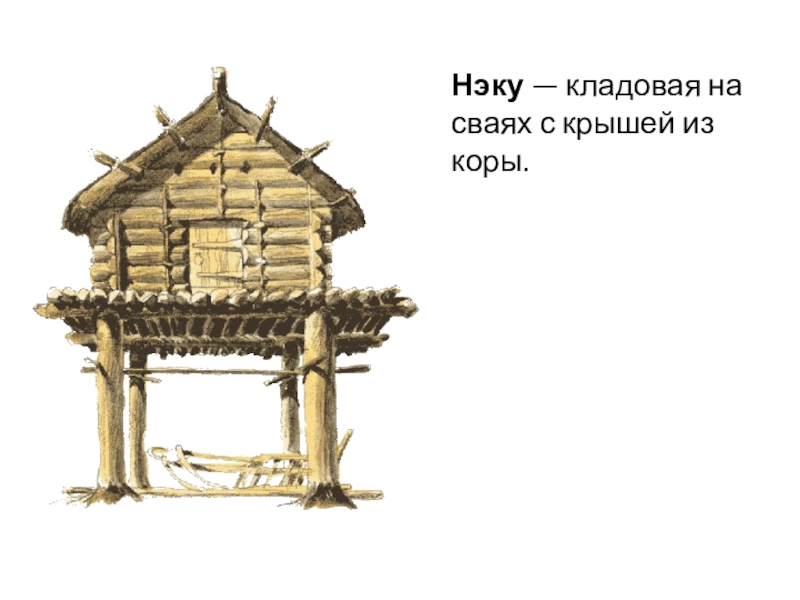 Слайд 50Нэку — кладовая на сваях с крышей из коры.