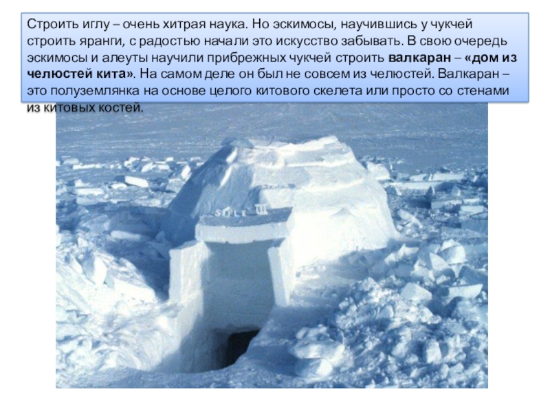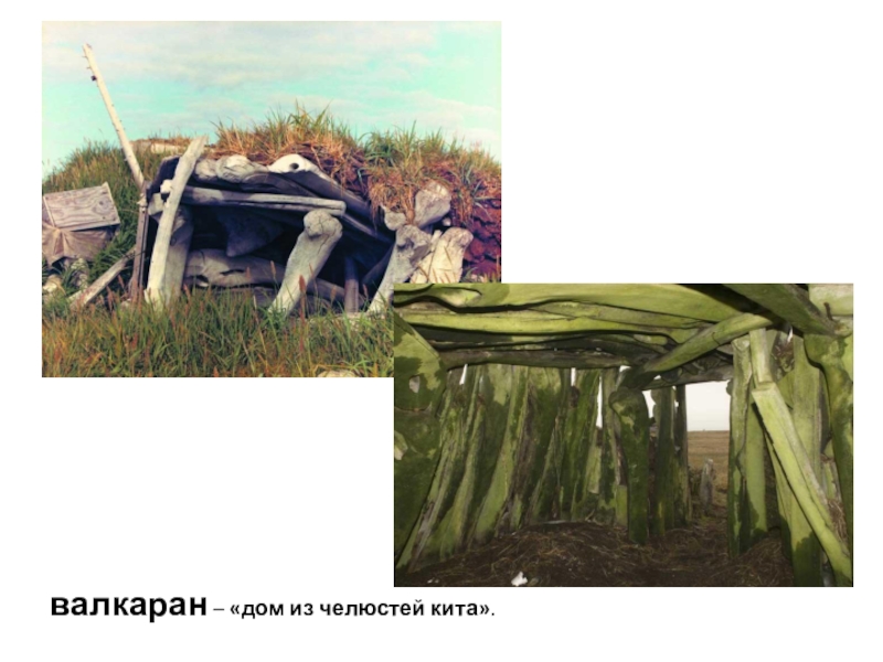 яранги, с радостью начали это искусство забывать. В свою очередь эскимосы и алеуты научили прибрежных чукчей строить валкаран – «дом из челюстей кита». На самом деле он был не совсем из челюстей. Валкаран – это полуземлянка на основе целого китового скелета или просто со стенами из китовых костей.