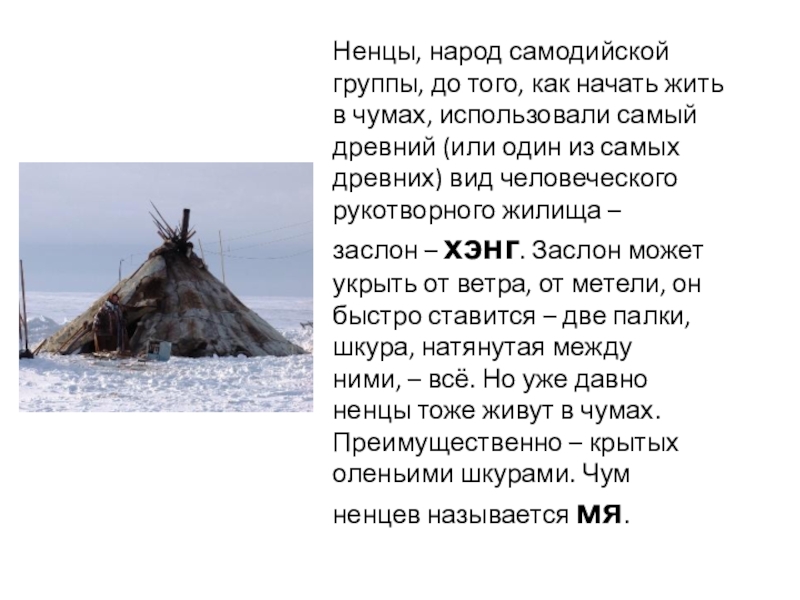 использовали самый древний (или один из самых древних) вид человеческого рукотворного жилища – заслон – хэнг. Заслон может укрыть от ветра, от метели, он быстро ставится – две палки, шкура, натянутая между ними, – всё. Но уже давно ненцы тоже живут в чумах. Преимущественно – крытых оленьими шкурами. Чум ненцев называется мя.