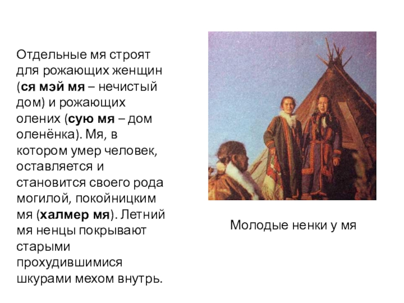 и рожающих олених (сую мя – дом оленёнка). Мя, в котором умер человек, оставляется и становится своего рода могилой, покойницким мя (халмер мя). Летний мя ненцы покрывают старыми прохудившимися шкурами мехом внутрь.