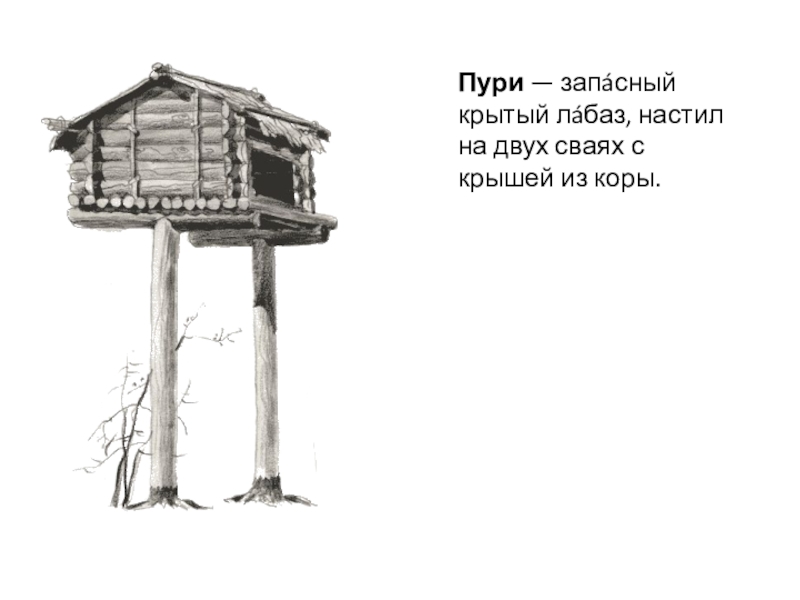 Слайд 51Пури — запáсный крытый лáбаз, настил на двух сваях с крышей