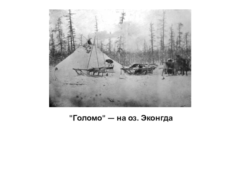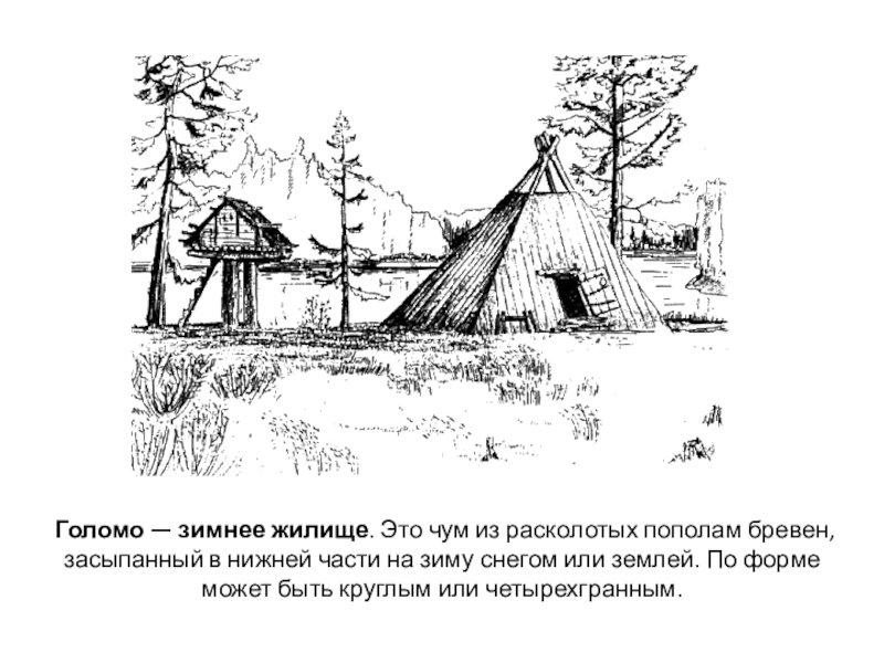 Слайд 45Голомо — зимнее жилище. Это чум из расколотых пополам бревен, засыпанный