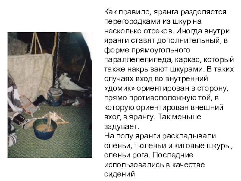 Слайд 15Как правило, яранга разделяется перегородками из шкур на несколько отсеков. Иногда