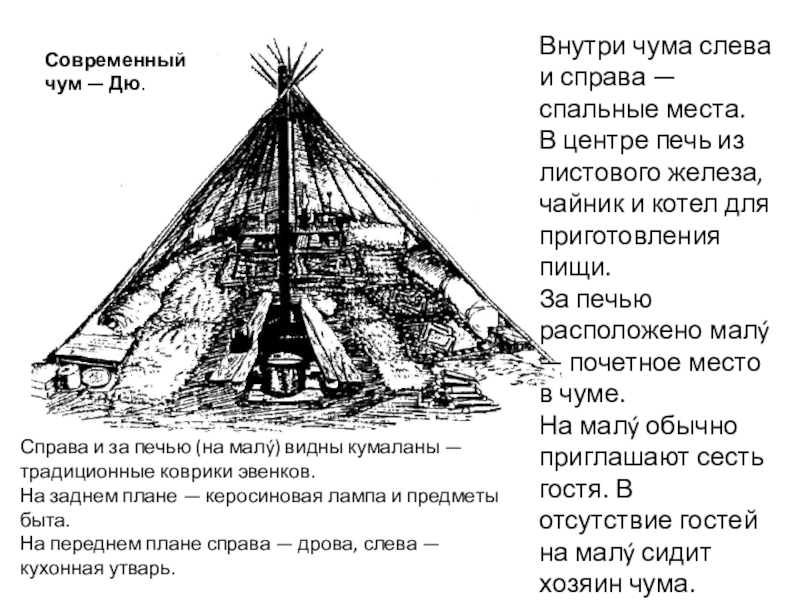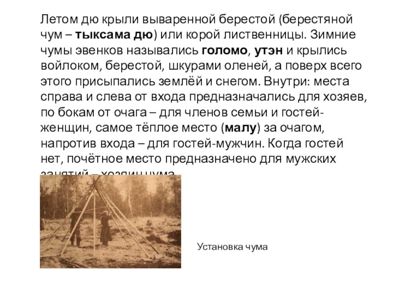 лиственницы. Зимние чумы эвенков назывались голомо, утэн и крылись войлоком, берестой, шкурами оленей, а поверх всего этого присыпались землёй и снегом. Внутри: места справа и слева от входа предназначались для хозяев, по бокам от очага – для членов семьи и гостей-женщин, самое тёплое место (малу) за очагом, напротив входа – для гостей-мужчин. Когда гостей нет, почётное место предназначено для мужских занятий – хозяин чума.