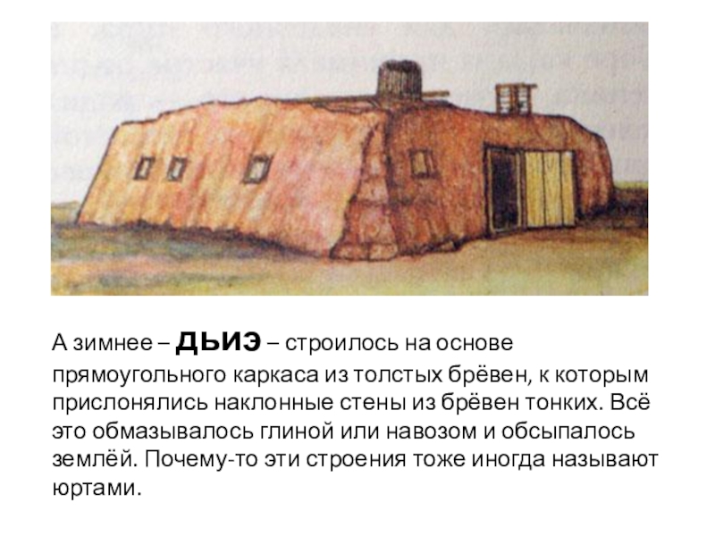 Слайд 33А зимнее – дьиэ – строилось на основе прямоугольного каркаса из толстых брёвен,