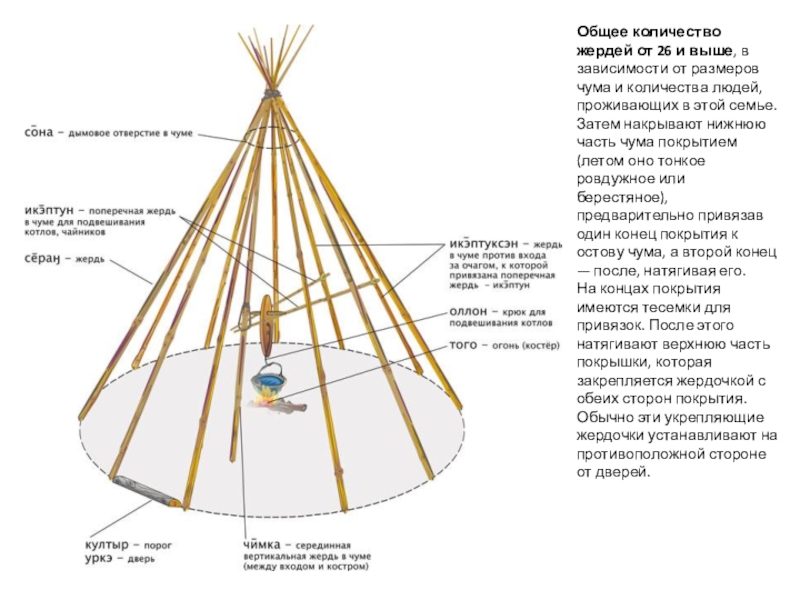 Обычно это три, четыре жерди, [которые обвязывают вверху тонкими корнями или тальниковыми прутьями]. Затем на них накладываются другие жерди, тоже гладкие и без сучьев.