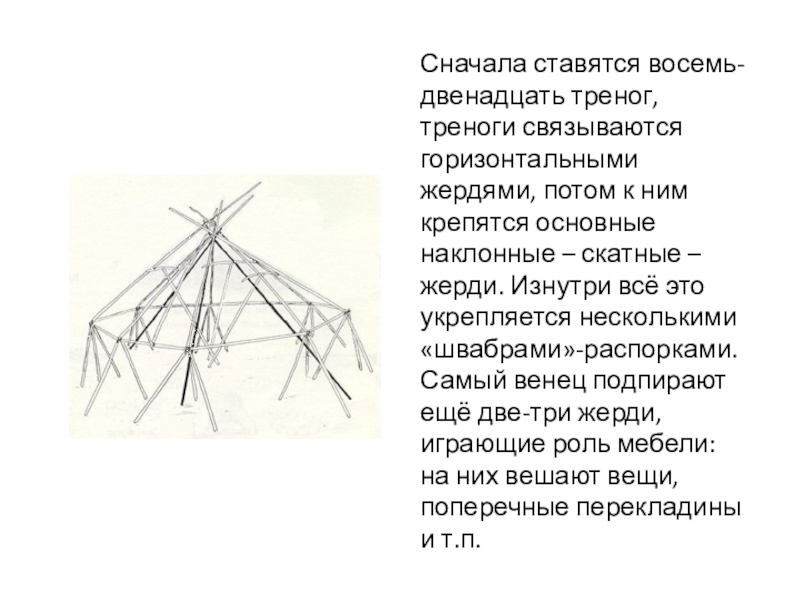 Слайд 14Сначала ставятся восемь-двенадцать треног, треноги связываются горизонтальными жердями, потом к ним