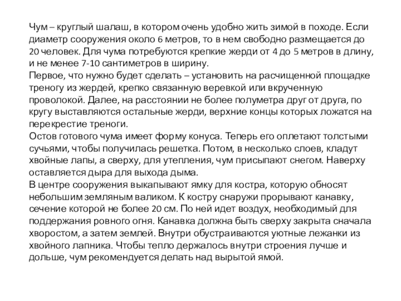 походе. Если диаметр сооружения около 6 метров, то в нем свободно размещается до 20 человек. Для чума потребуются крепкие жерди от 4 до 5 метров в длину, и не менее 7-10 сантиметров в ширину.