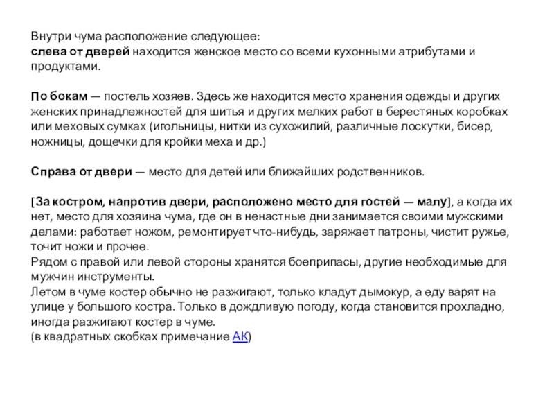 [За костром, напротив двери, расположено место для гостей — малу], а когда их нет, место для хозяина чума, где он в ненастные дни занимается своими мужскими делами: работает ножом, ремонтирует что-нибудь, заряжает патроны, чистит ружье, точит ножи и прочее.