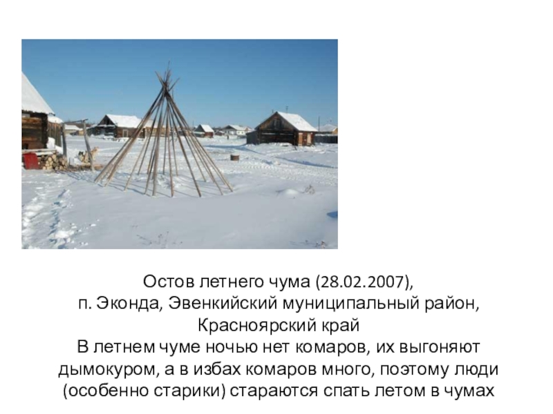 В летнем чуме ночью нет комаров, их выгоняют дымокуром, а в избах комаров много, поэтому люди (особенно старики) стараются спать летом в чумах