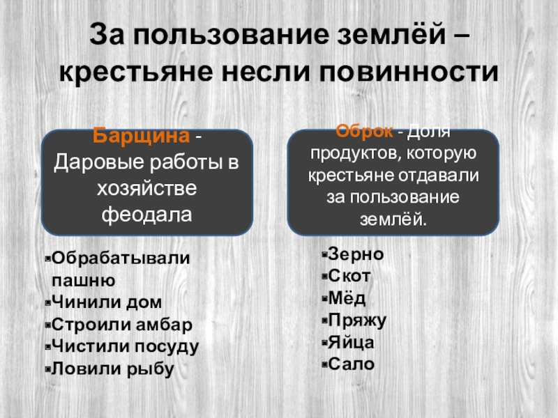 Оброк - Доля продуктов, которую крестьяне отдавали за пользование землёй.