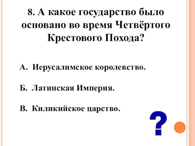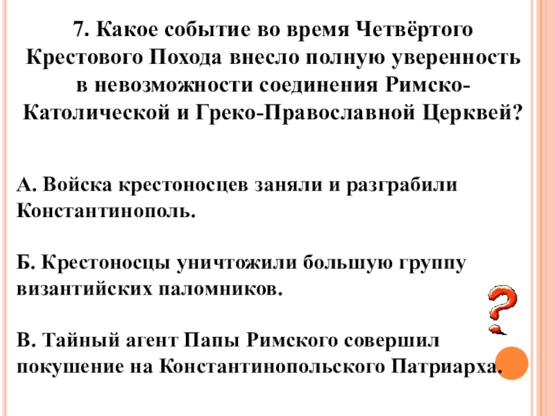 А. Войска крестоносцев заняли и разграбили Константинополь.