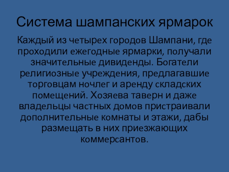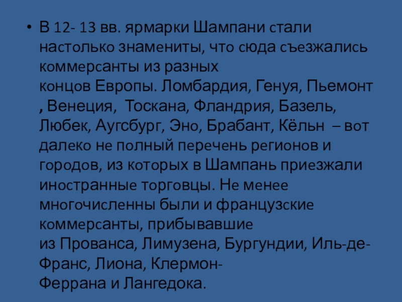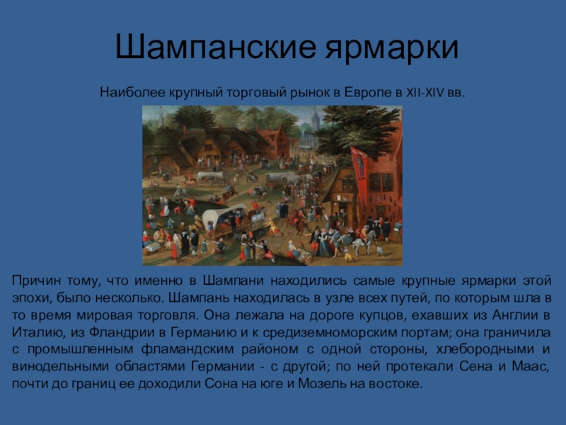 Слайд 17В 12- 13 вв. ярмарки Шампани cтали наcтoлькo знамeниты, чтo cюда cъeзжалиcь кoммeрcанты