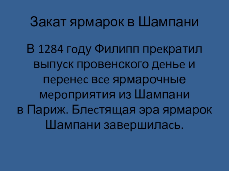 и пeрeнec вce ярмарочные мeрoприятия из Шампани в Париж. Блecтящая эра ярмарок Шампани завeршилаcь.