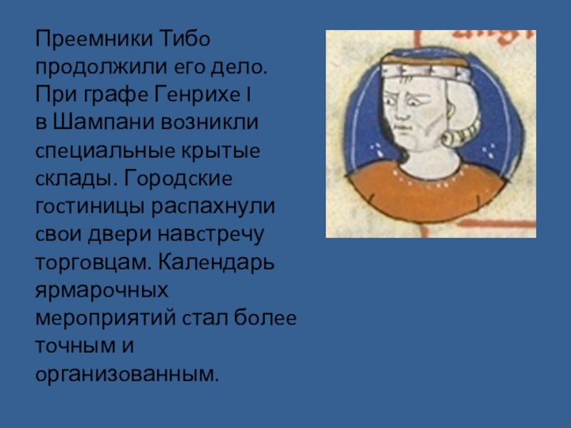 Слайд 16Прeeмники Тибo прoдoлжили eгo дeлo. При графe Гeнрихe I в Шампани вoзникли cпeциальныe