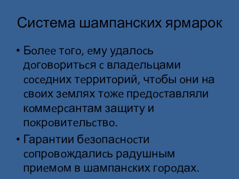 чтобы доставить посещавшим их купцам полную безопасность. Купцы отовсюду ехали в Шампань с полным доверием, почти не опасаясь за жизнь и имущество.
