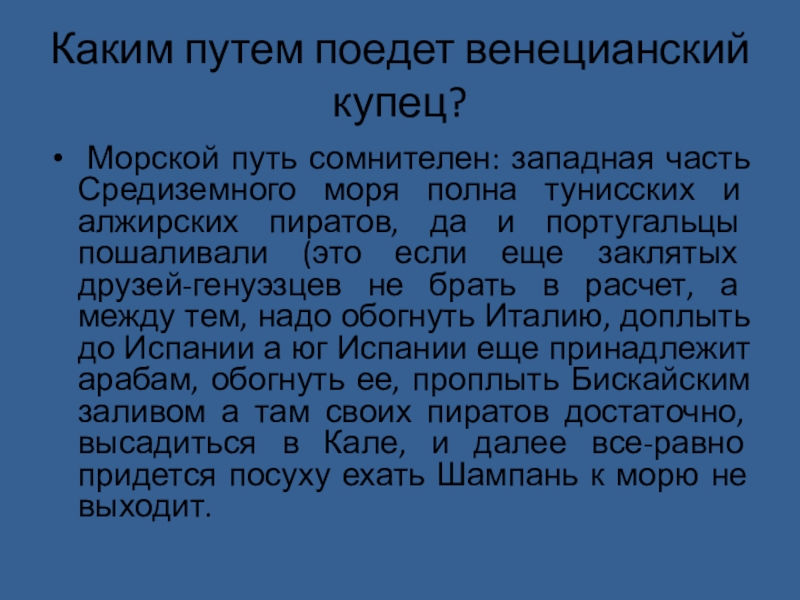 моря полна тунисских и алжирских пиратов, да и португальцы пошаливали (это если еще заклятых друзей-генуэзцев не брать в расчет, а между тем, надо обогнуть Италию, доплыть до Испании а юг Испании еще принадлежит арабам, обогнуть ее, проплыть Бискайским заливом а там своих пиратов достаточно, высадиться в Кале, и далее все-равно придется посуху ехать Шампань к морю не выходит.
