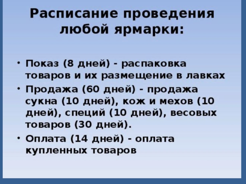 каждой из ярмарок, в общем, был следующий. Первая неделя отводилась на распаковку и раскладку товаров; в это время желающий мог увезти свое добро, не заплатив пошлин.