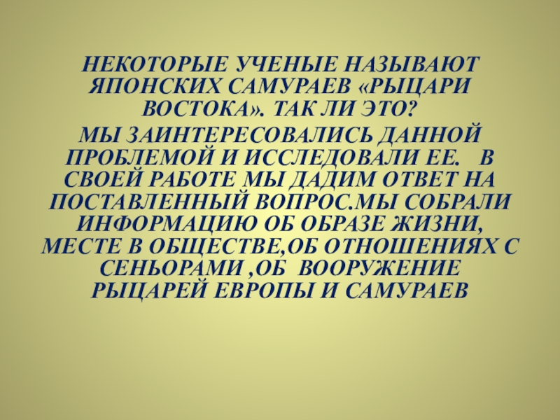 НЕКОТОРЫЕ УЧЕНЫЕ НАЗЫВАЮТ ЯПОНСКИХ САМУРАЕВ «РЫЦАРИ ВОСТОКА». ТАК ЛИ ЭТО?МЫ ЗАИНТЕРЕСОВАЛИСЬ ДАННОЙ ПРОБЛЕМОЙ И ИССЛЕДОВАЛИ ЕЕ. В СВОЕЙ РАБОТЕ МЫ ДАДИМ ОТВЕТ НА ПОСТАВЛЕННЫЙ ВОПРОС.МЫ СОБРАЛИ ИНФОРМАЦИЮ ОБ ОБРАЗЕ ЖИЗНИ,МЕСТЕ В ОБЩЕСТВЕ,ОБ ОТНОШЕНИЯХ С