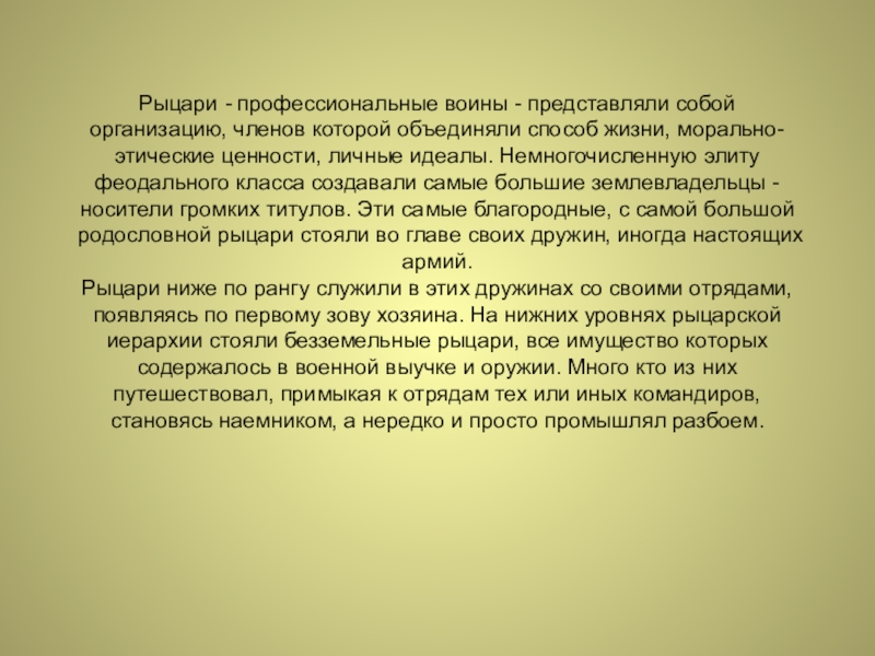 Рыцари - профессиональные воины - представляли собой организацию, членов которой объединяли способ жизни, морально-этические ценности, личные идеалы.