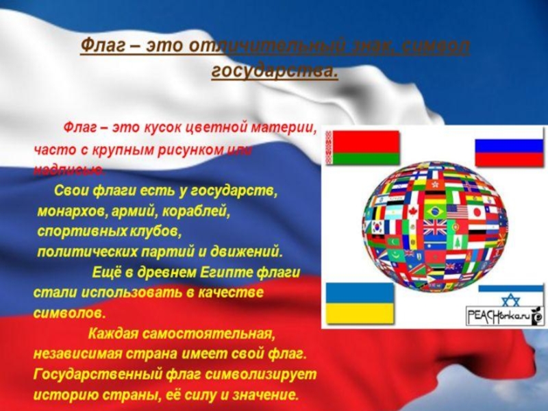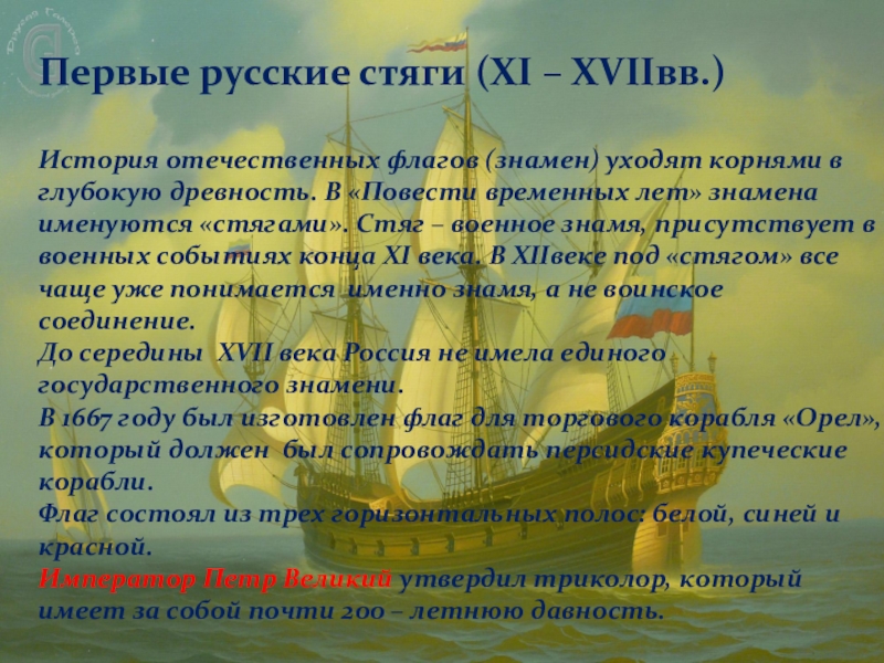 флагов (знамен) уходят корнями в глубокую древность. В «Повести временных лет» знамена именуются «стягами». Стяг – военное знамя, присутствует в военных событиях конца XI века. В XIIвеке под «стягом» все чаще уже понимается именно знамя, а не воинское соединение.