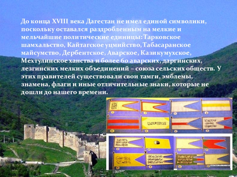 поскольку оставался раздробленным на мелкие и мельчайшие политические единицы: Тарковское шамхальство, Кайтагское уцмийство, Табасаранское майсумство, Дербентское, Аварское, Казикумухское, Мехтулинское ханства и более 60 аварских, даргинских, лезгинских мелких объединений – союза сельских обществ. У этих правителей существовали свои тамги, эмблемы, знамена, флаги и иные отличительные знаки, которые не дошли до нашего времени.