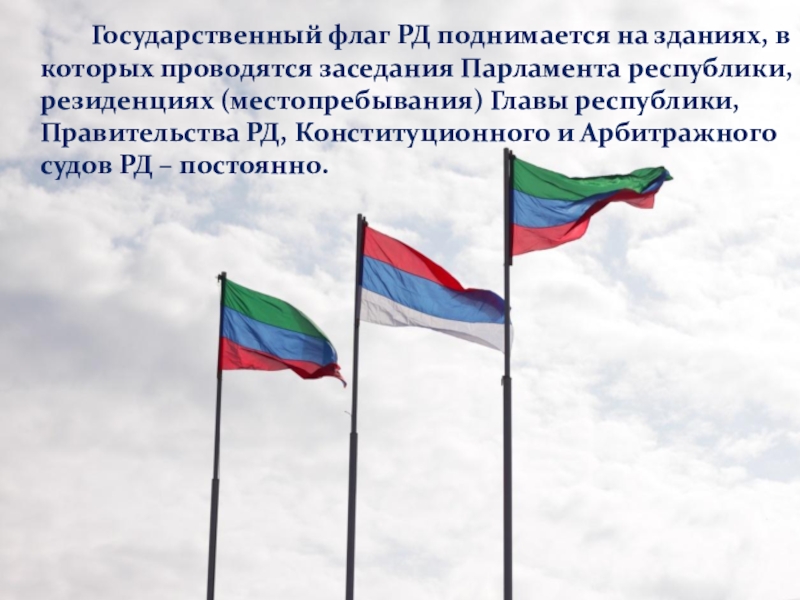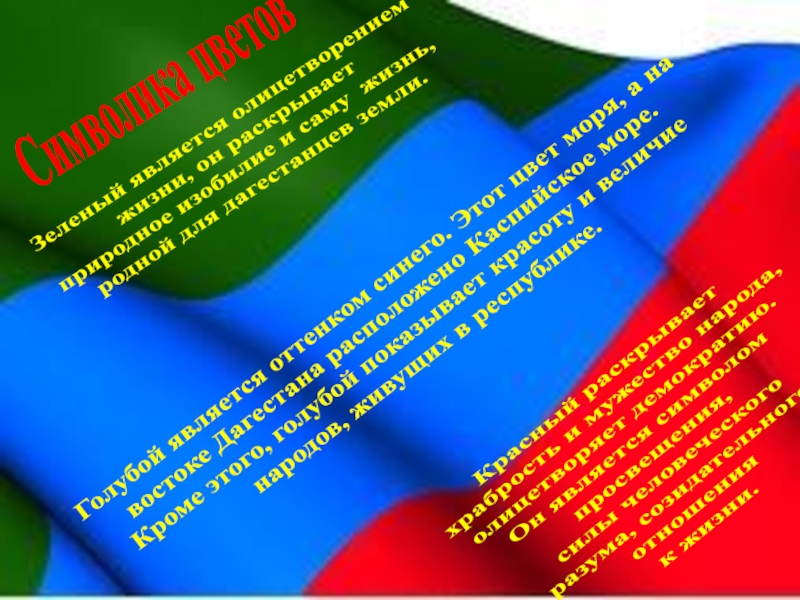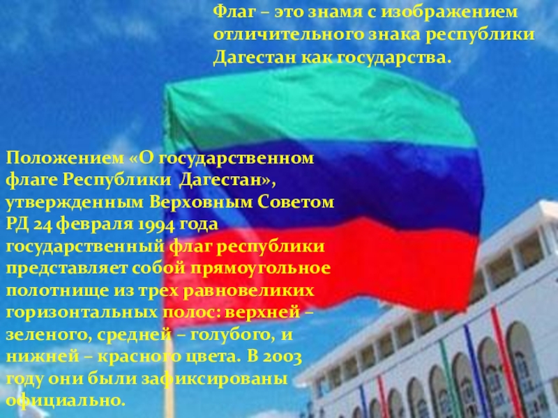 Положением «О государственном флаге Республики Дагестан», утвержденным Верховным Советом РД 24 февраля 1994 года государственный флаг республики представляет собой прямоугольное полотнище из трех равновеликих горизонтальных полос: верхней – зеленого, средней – голубого, и нижней – красного цвета. В 2003 году они были зафиксированы официально.